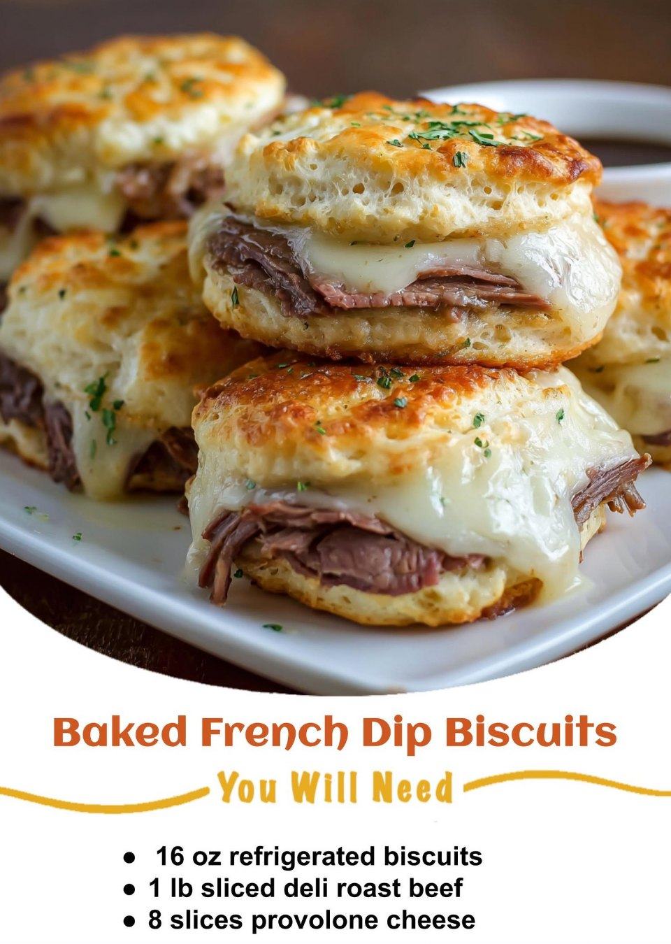 Here’s a delicious, easy recipe for Baked French Dip Biscuits—perfect for a cozy dinner or game-day meal. Think tender, buttery biscuits filled with roast beef and gooey cheese, served with savory au jus for dipping.