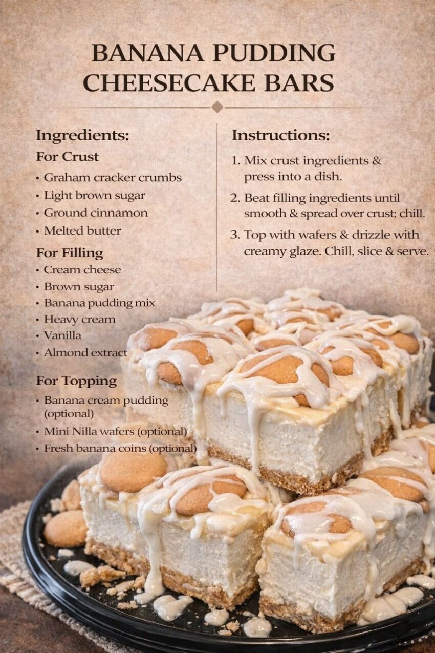 Here’s a Banana Pudding Cheesecake Bars recipe—creamy, nostalgic, and perfect for slicing 🍌🍰
