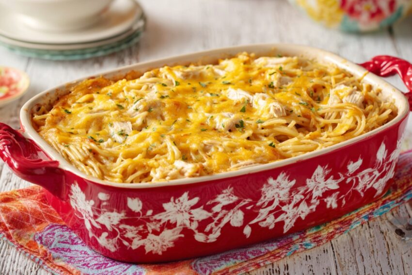 Chicken spaghetti is a comforting, baked pasta dish that combines cooked chicken, spaghetti noodles, a creamy or tomato-based sauce, and often cheese. It’s popular in Southern U.S. cooking and family-style meals.