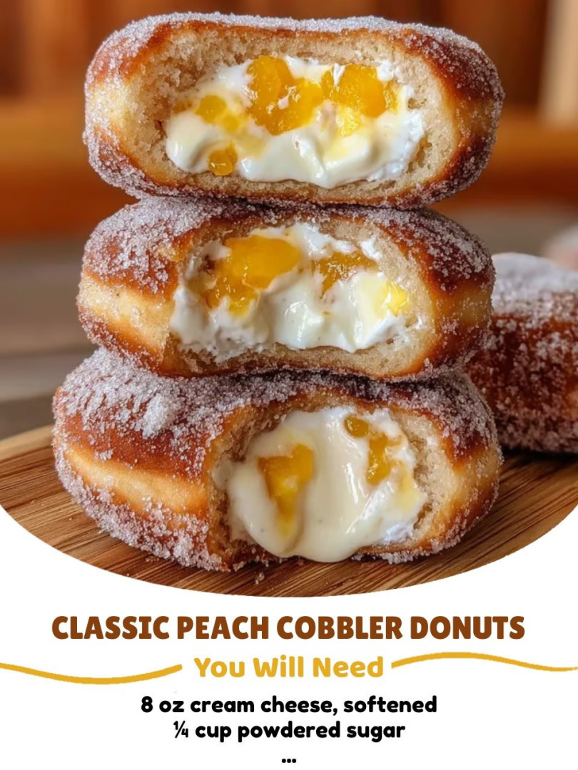 Here’s a Classic Peach Cobbler Cheesecake Donuts recipe—soft baked or fried donuts with a creamy cheesecake filling and warm peach cobbler topping 🍑🍩