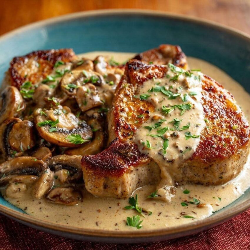 Here’s a creamy mushroom pork chops with garlic & thyme sauce recipe — rich, comforting, and ready in about 30 minutes 🍄🥩