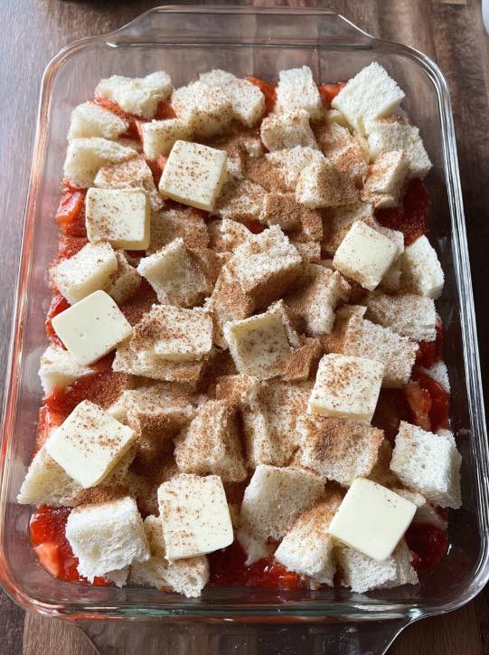 Place the cubed bread into a greased 9×13-inch baking dish, filling it up evenly.