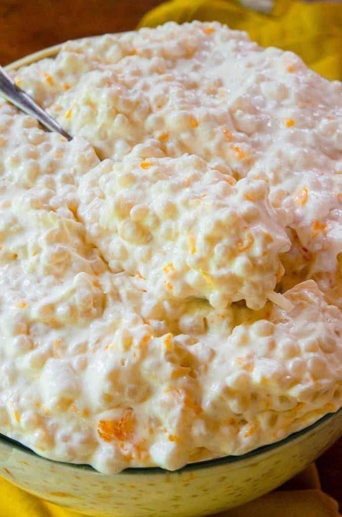 It’s often served at potlucks and holidays, especially in the U.S. West and Midwest. The “frog eyes” are actually tiny pasta pearls (acini di pepe) mixed with fruit, whipped topping, and a creamy pineapple custard dressing.