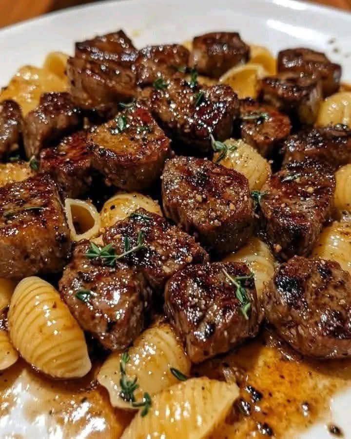 🥩 Garlic Butter Steak Bites with Parmesan Cream Shell Pasta