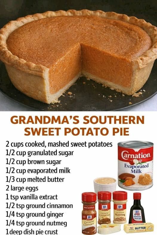 Here’s a classic, Grandma’s Southern Sweet Potato Pie—rich, creamy, warmly spiced, and just like it’s been passed down for generations 💛