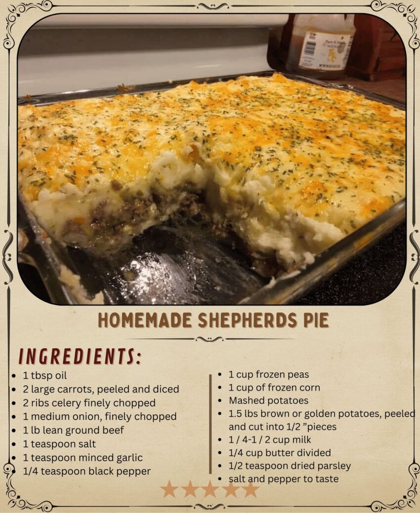 Here’s a classic homemade Shepherd’s Pie recipe 🥧—savory ground meat topped with creamy mashed potatoes.