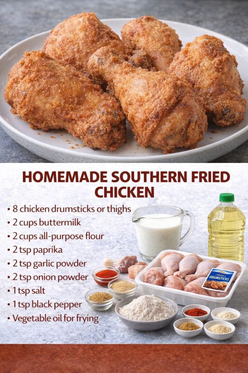 Oh yes—this is classic comfort food at its peak 🍗😌. Here’s a crispy, juicy homemade Southern fried chicken recipe that’s golden on the outside and tender on the inside.