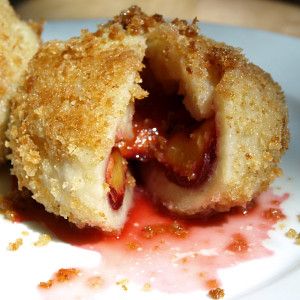 A beloved Hungarian dessert—soft potato dumplings with whole plums inside, rolled in buttery breadcrumbs.