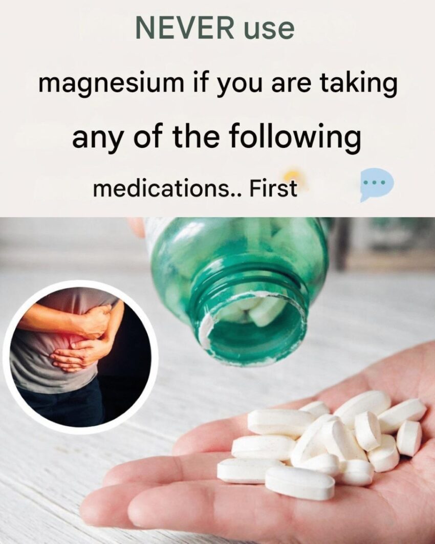 Magnesium is an essential mineral involved in nerve function, muscle contraction, heart rhythm, and bone health. Supplements or high dietary magnesium can interfere with certain medications or vice versa.