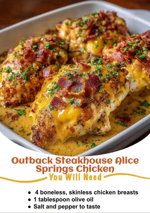Here’s a copycat recipe for Outback Steakhouse’s Alice Springs Chicken — juicy grilled chicken topped with mushrooms, bacon, melted cheese, and a creamy sauce 🍗🧀🥓