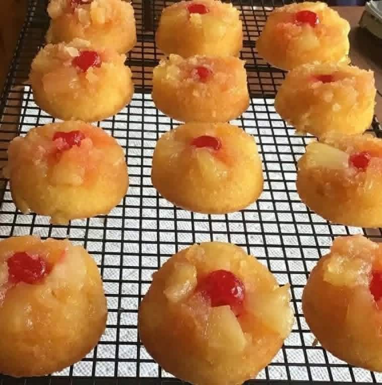 - Carefully invert cupcakes onto a wire rack or plate so the pineapple and brown sugar topping is on top.