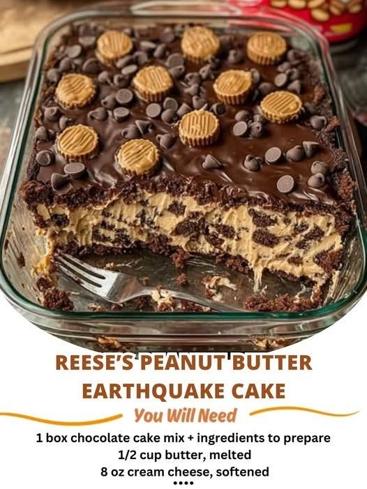 Ah, the Reese’s Peanut Butter Earthquake Cake—this is a decadent, over-the-top dessert that lives up to the “earthquake” name. It’s basically a chocolate and peanut butter lovers’ dream: layers of chocolate cake, peanut butter, chocolate chips, and often a creamy peanut butter swirl, all baked together into a gooey, fudgy masterpiece.