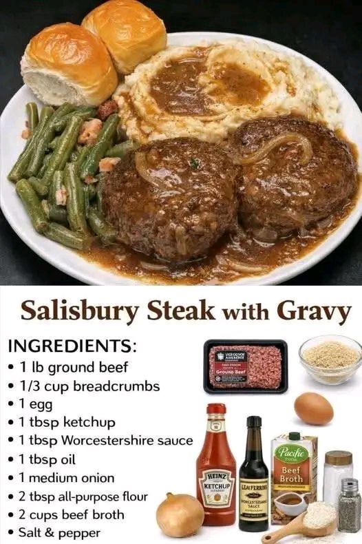 Here’s a simple and tasty way to make Salisbury steaks with mushroom gravy at home! I’ll break it down into the steaks and the gravy.