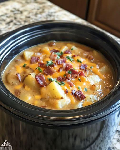 Here’s a rich, cozy Slow Cooker Loaded Baked Potato Soup—easy to prep and perfect for cold days 🥔🥣