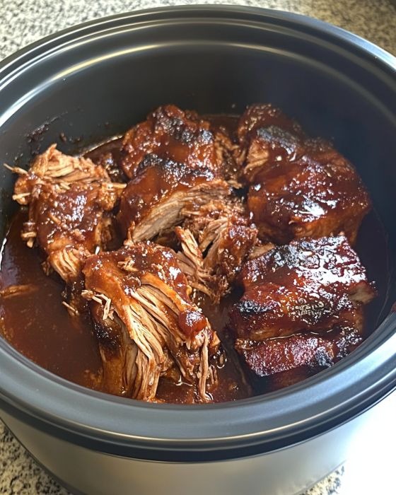 - Mix shredded pork back with the juices and BBQ sauce in the slow cooker.