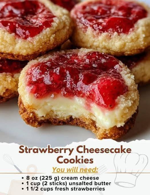 Here’s a simple and delicious recipe for Strawberry Cheesecake Cookies — soft, chewy, and filled with creamy cheesecake flavor and bursts of strawberry! 🍓🍪