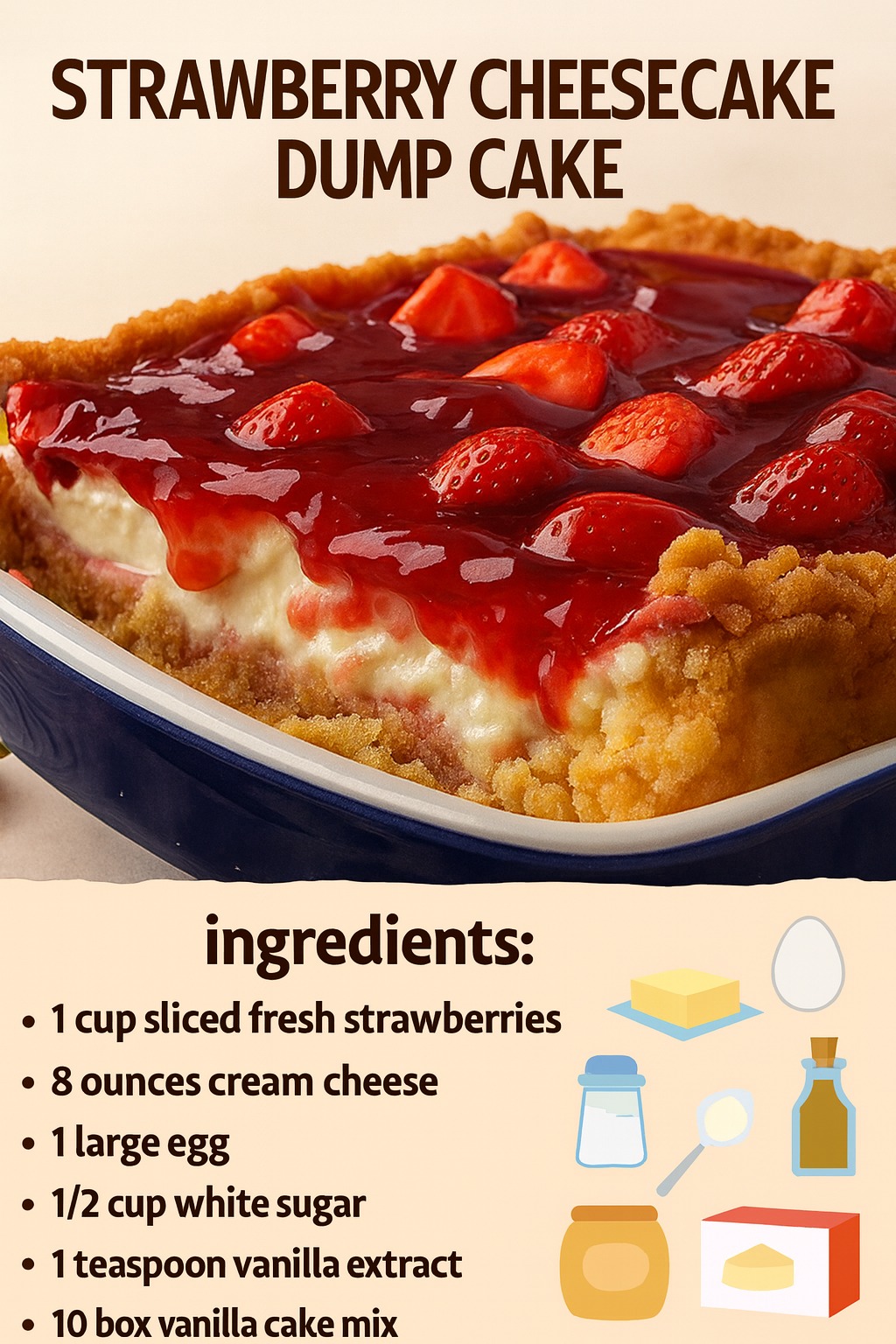 If you’d like, I can also give you a 3-ingredient version, a Crock Pot version, or a strawberry cheesecake dump cake using fresh berries!