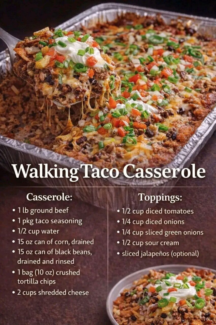 Here’s a Walking Taco Casserole recipe — all the flavors of a “walking taco” baked into a convenient, family-friendly dish. Think taco meat, cheese, chips, and toppings all in one pan. 🌮🧀