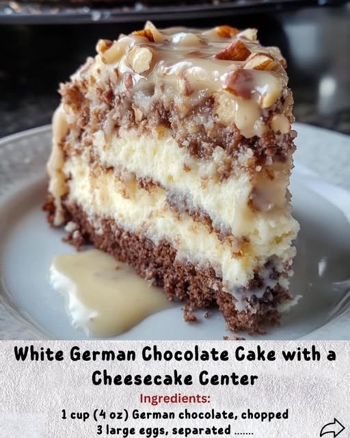 Here it is — a gorgeous, show-stopping White German Chocolate Cake with a Cheesecake Center. Imagine: tender white cake layers, a creamy cheesecake baked right in the center, and classic coconut-pecan German chocolate frosting. Rich, elegant, and absolutely unforgettable.