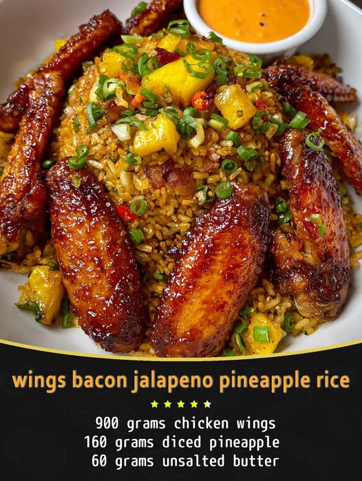 Here’s a bold, sweet-heat combo meal: Bacon-Jalapeño-Pineapple Rice with Wings 🔥🍍🥓🍗